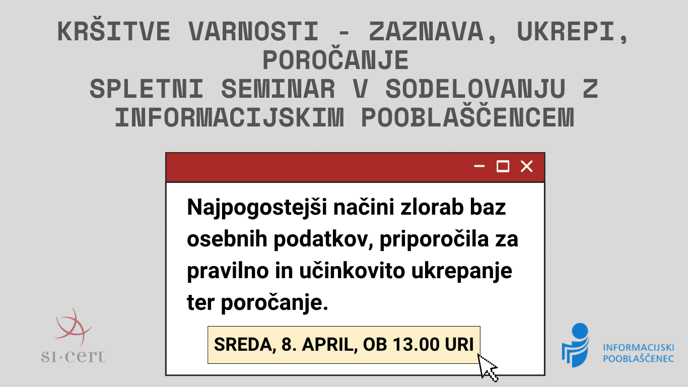 Na skupnem spletnem seminarju bosta odzivni center SI-CERT in Informacijski pooblaščenec osvetlila ključne vidike obravnave kršitev varnosti osebnih podatkov – od ustrezne prepoznave, ukrepov za zajezitev ter poročanja in obveščanja posameznikov.